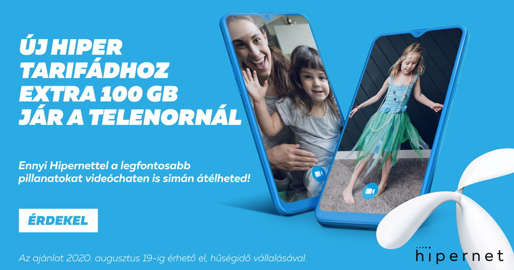 Extra 100 GB Hipernetet kapnak azok, akik június 2. és augusztus 19. között új számlás Hiper tarifa előfizetést kötnek hűségidő vállalásával. Az extra 100 GB egyszeri, 30 napig érvényes belföldi adatjegyet jelent, amely az új előfizetéshez kapott promóciós kóddal aktiválható augusztus 31-ig az ajándék 100 GB aktiválás oldalon. Az ajánlat egyaránt érvényes az új ügyfelekre, és a kártyás előfizetésről havidíjasra váltó telenorosokra.