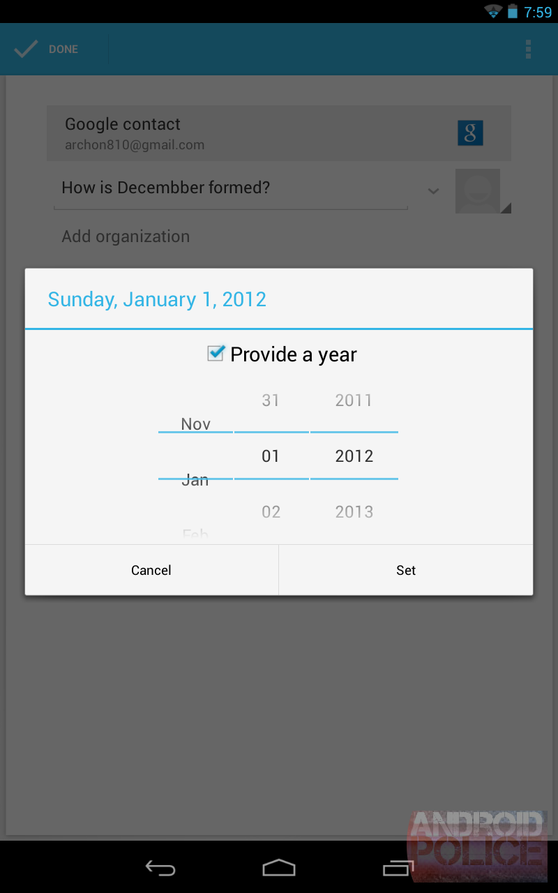 Hiba bukkant fel az Android 4.2 Jelly Bean rendszerben, ezúttal - eléggé érthetetlen okból - ez év decembere kimaradt a naptárból. A névjegyeknél be lehet állítani bárki születésnapját, ám ha ez decemberre esik, a telefon nem fog jelezni, ugyanis 2012 novembere után 2013 januárja következik a listában, így nincs Mikulás, nincs Karácsony és a Szilveszter is elmarad. Legalábbis elméletileg, hiszen a hiba feltárását követően feltehetően még időben elkészül a javítás. A probléma a Google Nexus 7 és a Nexus 10 nettáblát biztosan érinti, a lent látható kijelzőfotók (felül az Android 4.2, alul a még jó dátumot is tartalmazó Android 4.1) tanúsága szerint, de természetesen minden olyan készüléket is, amelyen hivatalosan vagy sem, de Android 4.2 Jelly Bean rendszer fut.