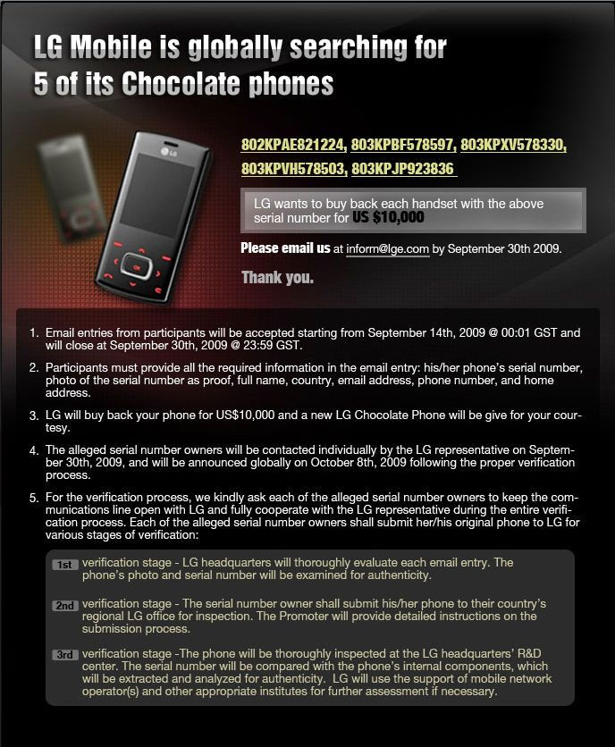 Az LG nem kevesebb, mint tízezer dollárt ajánlott fel annak, aki legalább egyet birtokol öt keresett telefonjából. A dél-korai gyártó keresi öt régi csokimobilját, amelynek szériaszámát is megadta. Az adott készülékeket csak 12 országban (az Egyesült Királyságban, Franciaországban, Németországban, Oroszországban, az Egyesült Arab Emirátusokban, Kínában, Hong Kongban, Thaiföldön, Brazíliában, Mexikóban, Koreában és Szingapúrban) értékesítették hivatalosan.