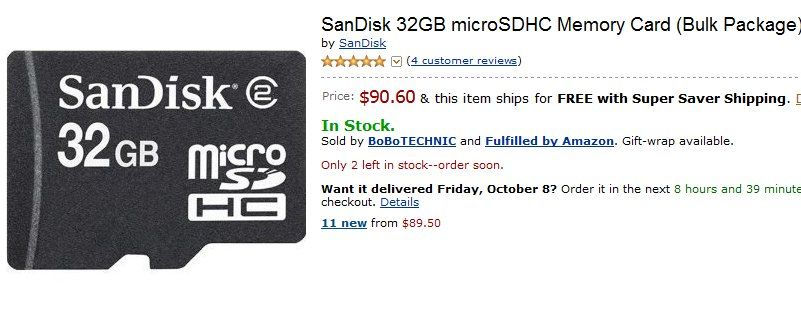 Az Amazon oldalán már 100 dollár alatt elérhetõ a 32 gigabájtos tárhelyet biztosító microSD kártya.