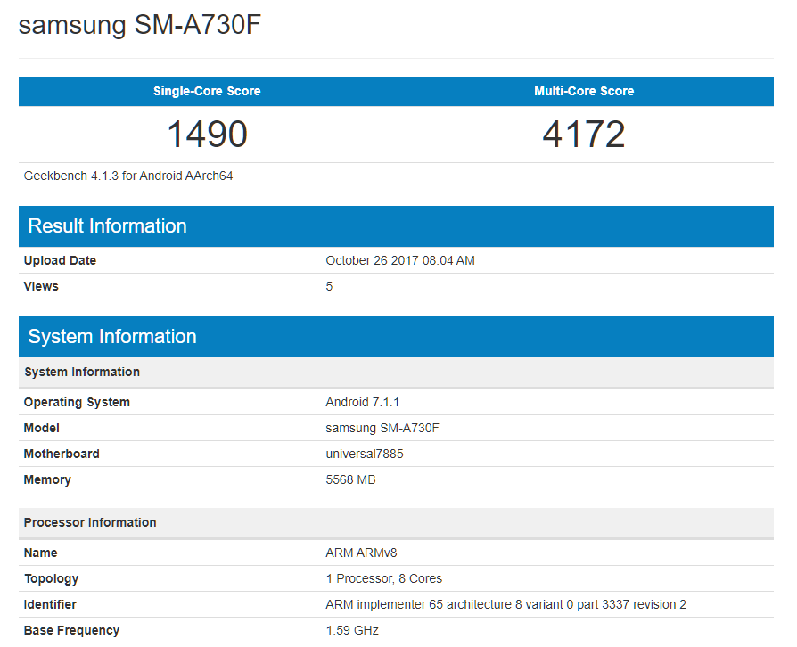 Az A7 a jelek szerint a nyáron megjelent, 14 nanométeres Exynos 7885 chipsettel, összesen nyolc maggal érkezik, melyeket Mali-G71 grafikus gyorsító egészít ki. Azonban még érdekesebb ehhez az összeállításhoz a 6 gigabájt RAM, amely eddig csak a csúcsmodellek kiváltsága volt, egészen pontosan kizárólag a Samsung Galaxy Note 8 – és néhány, Kínába szánt darab – rendelkezik a gyártó kínálatában ennyi memóriával. Az Exynos 7885 párban van a Qualcomm középkategóriás processzoraival, így nem lesz a Galaxy S9 jövőre ellenfele házon belül.