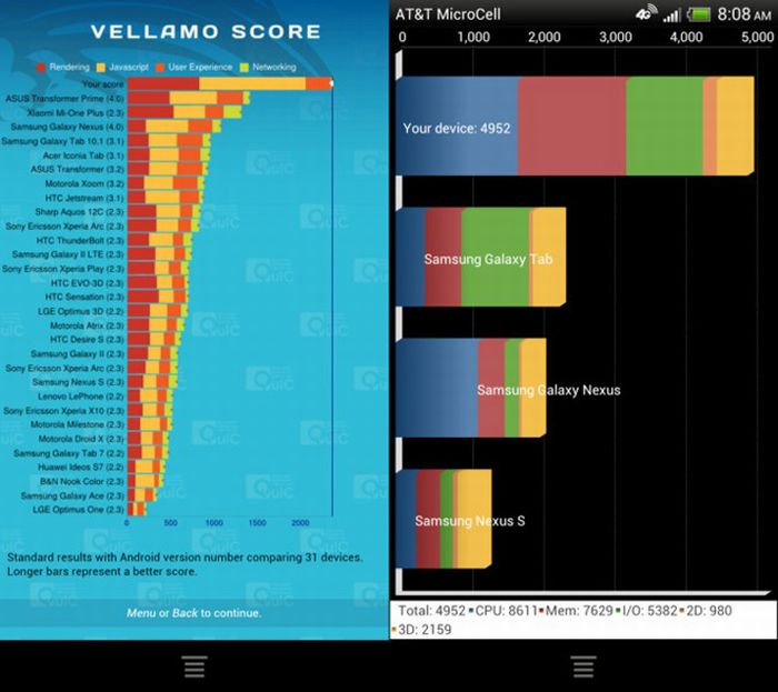 Ám a HTC One készülékek esetében erre nincs lehetőség a fizikai gombok miatt, így kénytelenek voltak a kijelző alján egy teljes sávot beáldozni egyetlen virtuális billentyű miatt, ami valljuk be, elég bután néz ki. Az alábbi képeken a HTC One X AT&T szolgáltatónak szánt verziójának benchmark eredményei láthatók (Vellamo és Quadrang alkalmazások), a program nem ICS-optimalizált, jól látszik a fekete sáv alul.
