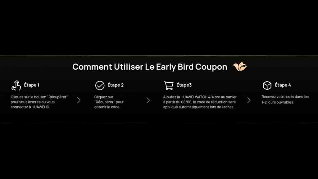 Mindössze annyit kell tennie, hogy bejelentkezik a Huawei ID azonosítójával a kupon átvételéhez, és hozzáadja a Huawei Watch 4 vagy Watch 4 Pro-t a vásárlási kártyához. A kuponkódot automatikusan alkalmazza a termékre, és levonja az árat a hivatalos címkéről. A vásárlást követően a Huawei France néhány napon belül kiszállítja a csomagot.