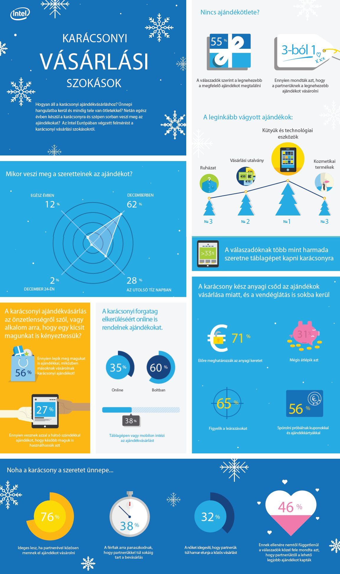 A karácsony az egyik, ha nem a legfontosabb, ünnep Magyarországon: együtt van a család, a családtagok kiszakadnak az év közbeni rohanásból és természetesen ajándékokkal lepik meg egymást. Az Intel Európa tíz országában végzett kutatást arról, hogy az egyes területeken mi jellemzi a karácsonyi ajándékvásárlást. Mint az Intel nemrégiben végzett felméréséből kiderül, a legtöbb megkérdezett azt találja a legnehezebbnek a karácsonyi előkészületekben, hogy megtalálja a megfelelő ajándékot szeretteinek. Érdekes megállapítása a kutatásnak, hogy nagyon sokan szívesen látnának a fa alatt technológiai kütyüt vagy más eszközt.