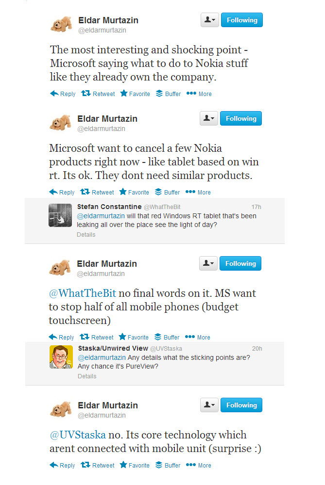 Az orosz blogger, Eldar Murtazin szerint a Microsoft nem örül a Nokia tabletjének és csökkentené az Asha modellek számát is. Eldar Twitter üzenetei szerint a redmondi óriás próbálja minél több jövendõbeli, ám még idénre tervezett Nokia készülék megjelenését törölni. Ilyen például a Nokia Sirius tablet, valamint több olcsó, Asha érintõkijelzõs telefon. A Microsoft úgy viselkedik mintha már most sajátja lenne a finn cég mobilos részlege. Jelenleg több nézeteltérés is akad a két cég között, hogy bizonyos Nokia eszközök, fejlesztések együtt járnak-e a felvásárlással vagy sem. Mindenesetre meglepõ a Microsoft viselkedése, hiszen a Nokia részvényesei még nem hagyták jóvá a felvásárlást, így akár visszafelé is elsülhet az akvizíció.