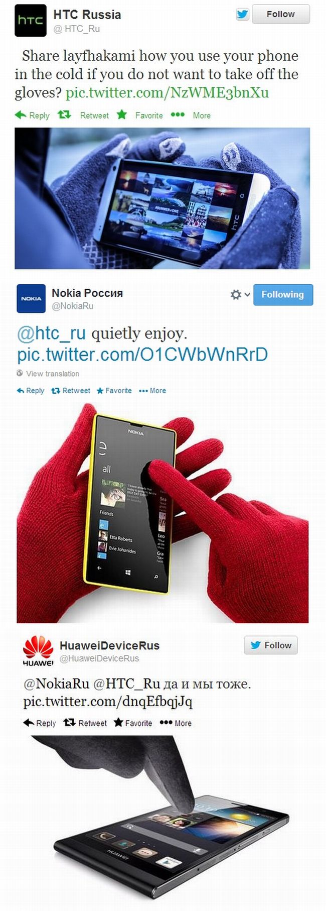 A tajvani gyártó orosz kirendeltsége a Twitterre kitett egy képet, amelyből a Nokia igen gyorsan gúnyt űzött. Amint az ismeretes, a Nokia Lumia új modelljei olyan megjelenítőt kaptak a Synaptics egyik fejlesztésének jóvoltából, amelyek akár átlagos kesztyűben is használhatók. Annak ellenére, hogy nincs exkluzív szerződése a finneknek a céggel, mégsem sok gyártó telefonjában található ilyen kijelző. Többek között a HTC One, a HTC One Mini és a HTC One Max mobilokban sincs. A HTC Russia megkérdezte Twitteren a felhasználóit, hogyan használják télen a mobiljukat, ha nem akarják levenni a kesztyűt a hideg miatt. Nos a Nokia Russia gyorsan reagált a kérdésre, majd reagált a Huawei is, amely Ascend P6 mobilja szintén képes a kesztyűs kezelésre. Ciki?