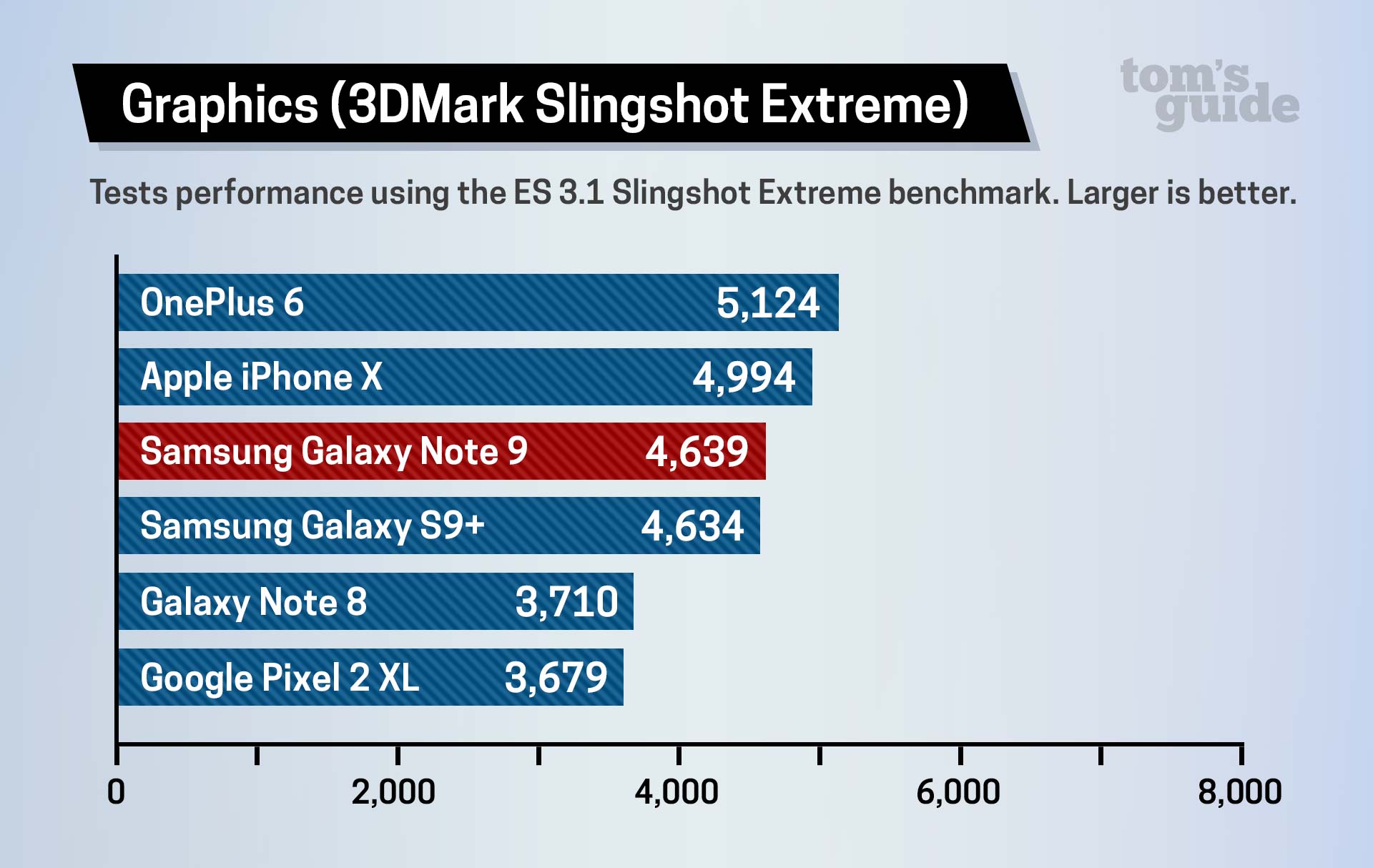 A 3D Mark a grafikus megoldásokra fókuszál, ahol a Note 9 újfent az iPhone X mögé került, itt azonban a három modell közül messze magasan a legolcsóbb telefon, a OnePlus 6 teljesített a legjobban. A Note 9 arányaiban a Galaxy S9+-szal van párban, ez nem is annyira meglepő az azonos hardver miatt.