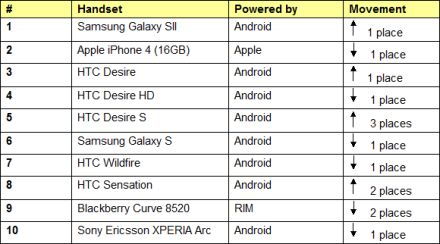 Nagy-Britanniában átvette a vezetést a top 10-es listában a régóta élen álló Apple iPhone 4-től a Samsung i9100 Galaxy S II. Hosszú idő után sikerült kiütni az iPhone-t a nyeregből, ám a britek egyre jobban szeretnének Galaxy S II-t birtokolni mint a hamarosan leváltásra kerülő iPhone-t. Jól látszik a tízes listában, hogy a HTC nagyon domináns, tízből öt ugyanis a tajvani gyártó terméke a legjobban fogyó mobilok között, ahogy az Android is nagyon erős, tízből nyolc készüléken a Google operációs rendszere fut. A legnagyobb sikert a HTC Desire S érte el, amely áprilisban három helyet javított, a legnagyobb bukást pedig a BlackBerry Curve 8520 könyvelhette el. A május és június nagy várományosa az itt még épphogycsak felbukkant HTC Sensation, amely alig-alig kapható, ám máris hatalmas siker. A régebbi tendenciákat meg lehet tekinteni a listát készítő USwitch oldalán.