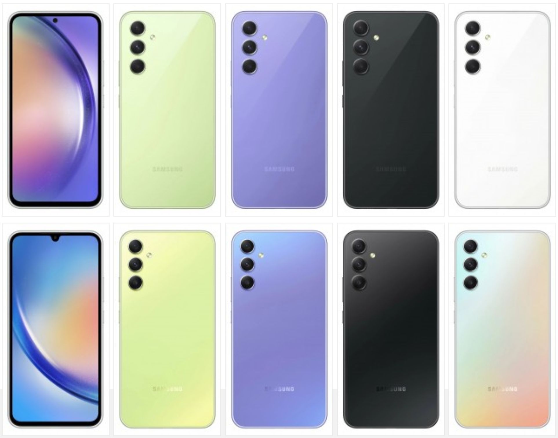 A Samsung Galaxy A34 nagyobb, 6,6 hüvelykes kijelzővel rendelkezik majd - szintén 120Hz-es AMOLED kijelzővel, FHD+ felbontással. Az Exynos helyett a Dimensity 1080 chipsetet fogja használni, és 48+8+5MP-es hátsó és 13MP-es előlapi kamerákkal fog rendelkezni. Emellett 5000 mAh-s akkumulátorral dolgozik majd a burkolat alatt, mindkét telefon IP67-es por- és vízállósági besorolású lesz.