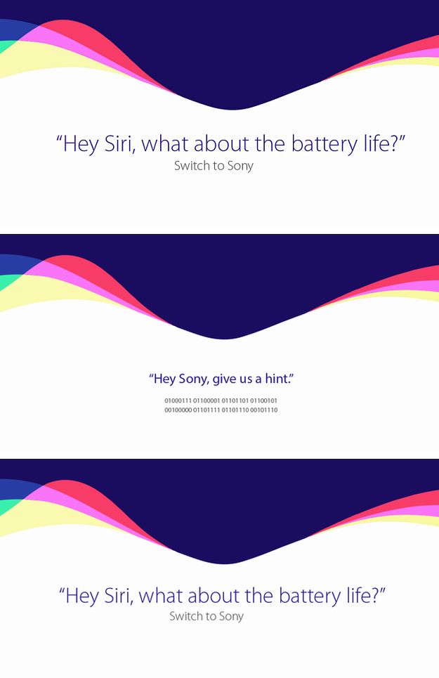 A japán gyártó nem gyõzte kivárni a hivatalos bemutatót, hogy rögtön trollkodásba is kezdjen. Szeretjük az ilyen vicces civakodásokat, ahol a felhasználók, legyenek akár Apple, akár Sony pártiak, csak egy jót mosolyoghatnak (merthogy erre lesz válasza az Apple-nek, az biztos). Mint ismeretes, az Apple iPhone 6s egyik új funkciója a bármikor rendelkezésre álló „Hey Siri” digitális asszisztens elérése. A Sony ezt egy kicsit továbbgondolta, majd Twitteren meg is mutatta rajongóinak, szerintük Siri válasza az új telefon akkumulátor üzemidejére ennyi lenne: válts Sony-ra. Egy másik változatban a felkiáltást „Hey Sony”-ra változtatták, majd a „Game on” bináris leírását láthatjuk.
