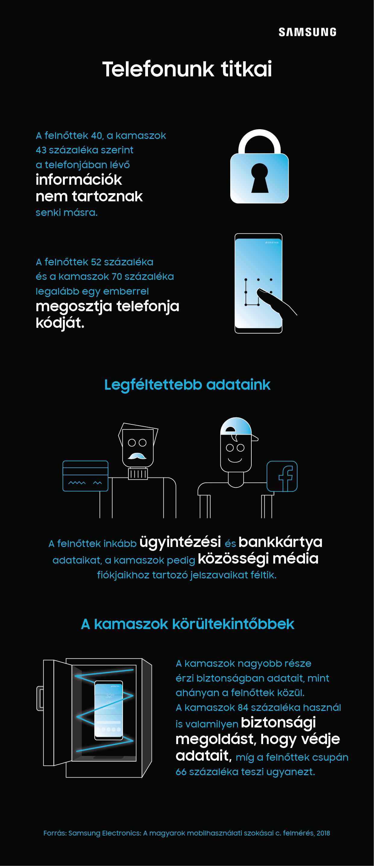 Mobilunk megkönnyíti az életünket, mert számos bizalmas és személyes dolgot egy helyen, mindig a kezünk ügyében tárolhatunk, legyen szó társkeresésről, bankolásról, online vásárlásról. „Életünk szervezését, a kapcsolattartást és ügyeink kezelését is hatalmas mértékben könnyíti meg az okostelefon – vélekedik a kutatás eredményeivel kapcsolatban Samu Zsófia, a Samsung Electronics Magyar Zrt. kommunikációs vezetője. - Adataink védelme miatt azonban egyre inkább javasolt az elővigyázatosság. Minél jobban támaszkodunk az okostelefon által nyújtott előnyökre, annál inkább tisztában kell lenni mobilunk védelmének fontosságával is. A kutatás számai azt mutatják, hogy ebben a kamaszok igen tudatosak, ami örvendetes fejlemény, de fontos, hogy mindenki, a felnőttek is, minél nagyobb arányban ismerjék az esetleges kockázatokat, és használják a készülékekbe épített biztonsági funkciókat."