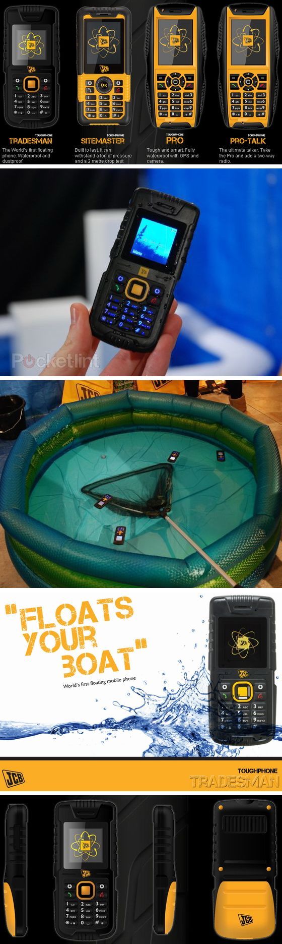 A brit székhelyû JCB cég nem elõször készít telefont, amely extrém helyzetekben is megállja a helyét. A gyártó most egyszerre négy új mobilt is bemutatott, ezek a JCB Tradesman, a JCB Toughphone Sitemaster, a JCB Toughphone Pro és a JCB Toughphone Pro-Talk. Ezek közül az elsõ a legizgalmasabb, amely megkapta a Guiness Rekordok Könyvétõl a Világ elsõ lebegõ telefonja címet.