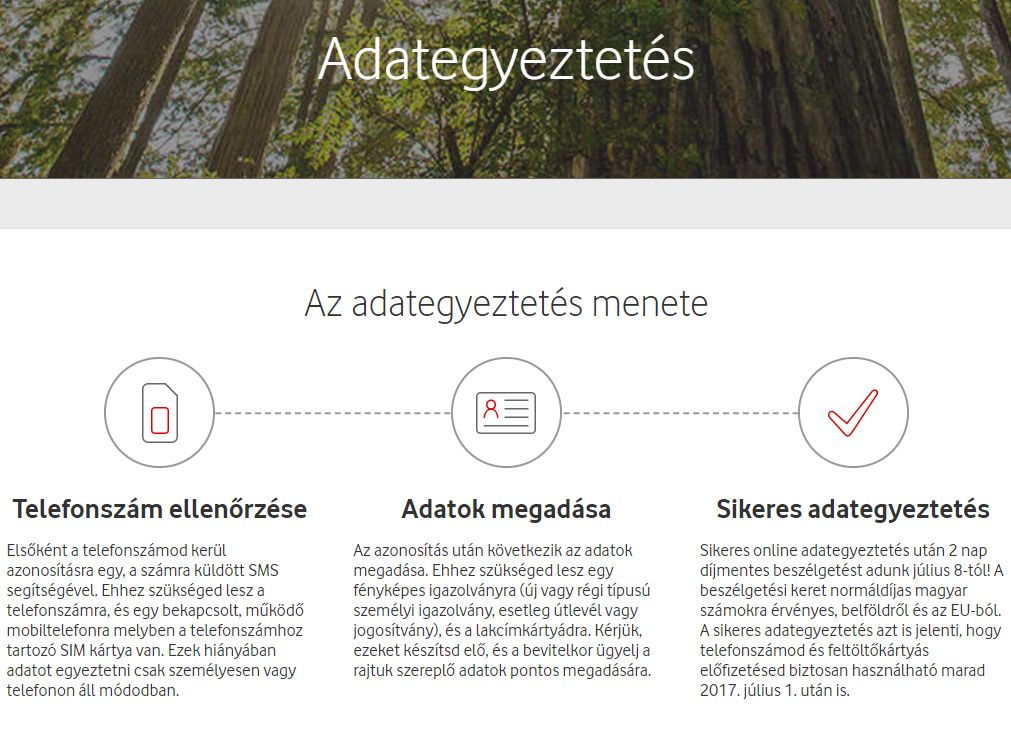 A Vodafone sajtóosztályán elmondták, hogy a 2017. január 1. előtt szerződött prepaid SIM kártyás ügyfeleik a most induló online felületen minden eddiginél kényelmesebben egyeztethetik adataikat. Az adategyeztetés személyazonosító okmányokkal végezhető el, az adategyeztetés címen elérhető online felület mellett a 1270-es, díjmentesen hívható Vodafone ügyfélszolgálati telefonszámon, valamint személyesen, a Vodafone üzletekben. Adataikat június 30-áig online sikeresen egyeztető ügyfeleinek július 8-tól a Vodafone 2 nap díjmentes beszélgetést ad. A beszélgetési keret belföldről és az EU-ból, normáldíjas magyar számokra indított hívások esetén érvényes.