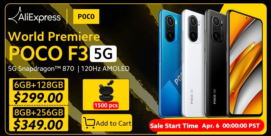 - A Poco F3 6+128 gigabájtos verzióban 299 euróba kerül EU raktárból, aki pedig a 8+256 gigabájt mellett döntene, 349 eurót kell fizetni EU raktáros szállításhoz. A POCO50 kódot használva 50 euró lejön az árakból!