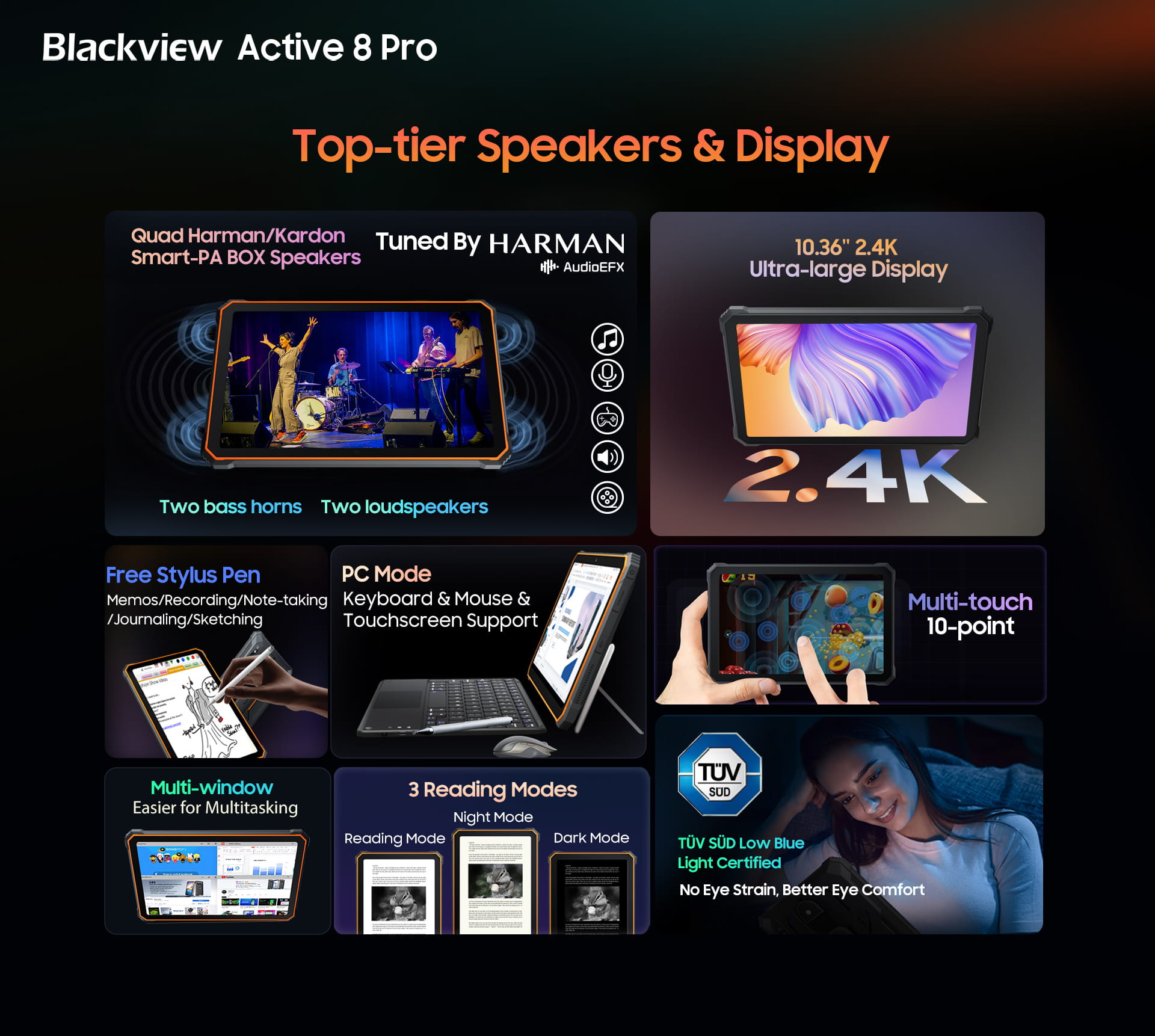 Ami a kijelzőt és a hangszórókat illeti, az Active 8 Pro egy 10,36 hüvelykes 2,4K-s ultra nagy kijelzővel érkezik, amely a TÜV SÜD minősítéssel rendelkezik az alacsony kék fényhez. Ha PC módban Bluetooth billentyűzethez és egérhez csatlakozik, az Active 8 Pro úgy működik, mint egy nagy teljesítményű érintőképernyős PC. A mellékelt érintőceruza precíz dokumentumszerkesztést és jegyzetelést tesz lehetővé.