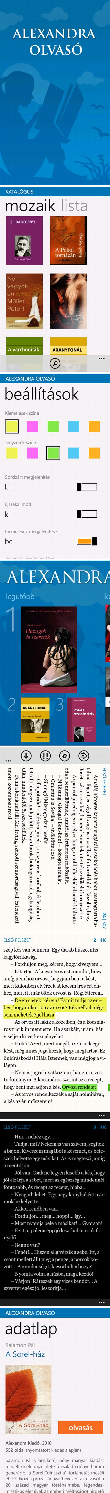 Az Alexandra, a Microsoft és a Nokia közös fejlesztésű, ingyenes Windows Phone alkalmazása a klasszikus magyar irodalom műremekei és kortárs szerzők művei közül tartalmaz összesen 25 e-könyvet. Az Alexandra Olvasó letöltését követően a könyvek olvasása már nem generál adatforgalmat, mivel az alkalmazás a könyveket a telefonkészülékre menti, így az olvasmányok később internetkapcsolat nélkül is elérhetők. Az alkalmazás listájában a kiválasztott könyv borítóképére kattintva, először egy rövid összegzést kapunk a műről, majd az olvasás gombra kattintva nekikezdhetünk a könyvnek. Emellett az applikáció lehetőséget biztosít arra is, hogy a szövegből kiemeljünk egy-egy részt, vagy jegyzetet készítsünk, melyeket később vissza is kereshetünk.