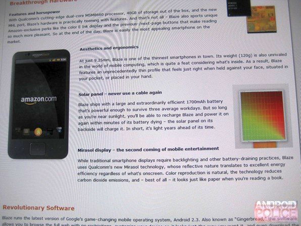 A pletykák szerint a kétmagos, 1.2 gigahertzes, Qualcomm MSM8660-as processzorral, fél gigabájt RAM-mal és 32 gigabájt háttértárral ellátott Amazon Blaze-ben egy 4.3 colos, rendkívül energiatakarékos Mirasol kijelző lesz, elérhető egy hátlapi öt és egy előlapi 1.3 megapixeles kamera, microUSB és microHDMI csatlakozó, DLNA-támogatás, de nem maradhatott ki a listából a ma oly' népszerű NFC-támogatás sem, ahogy a kötelező Bluetooth és HSPA+ sem.
