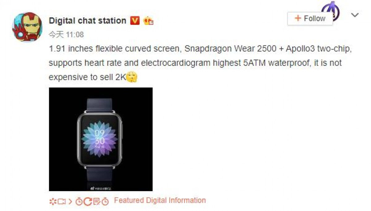 Eszerint 1.91 colos, rugalmas és hajlított OLED kijelző várható, az Android Wear rendszer alatt a Snapdragon Wear 2500 lapkakészlet dolgozik Apollo 3 co-processzorral, amely támogatja a pulzusmérést és az EKG funkciót, ha ez igaz, úgy az Apple Watch komoly ellenfele lehet az Oppo órája.
