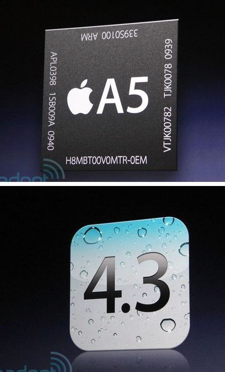 Az iOS 4.3 az iPad 2-vel debütál március 11-én. A következő újdonság az Apple A5 processzora, amely az A4 alapjaira épült. Az A5 támogatja a kétmagos felépítést és kétszer gyorsabb mint az A4, a grafikus teljesítménye pedig kilencszer jobb elődjénél, ennek ellenére még az A4-nél is kevesebb energiával is beéri.
