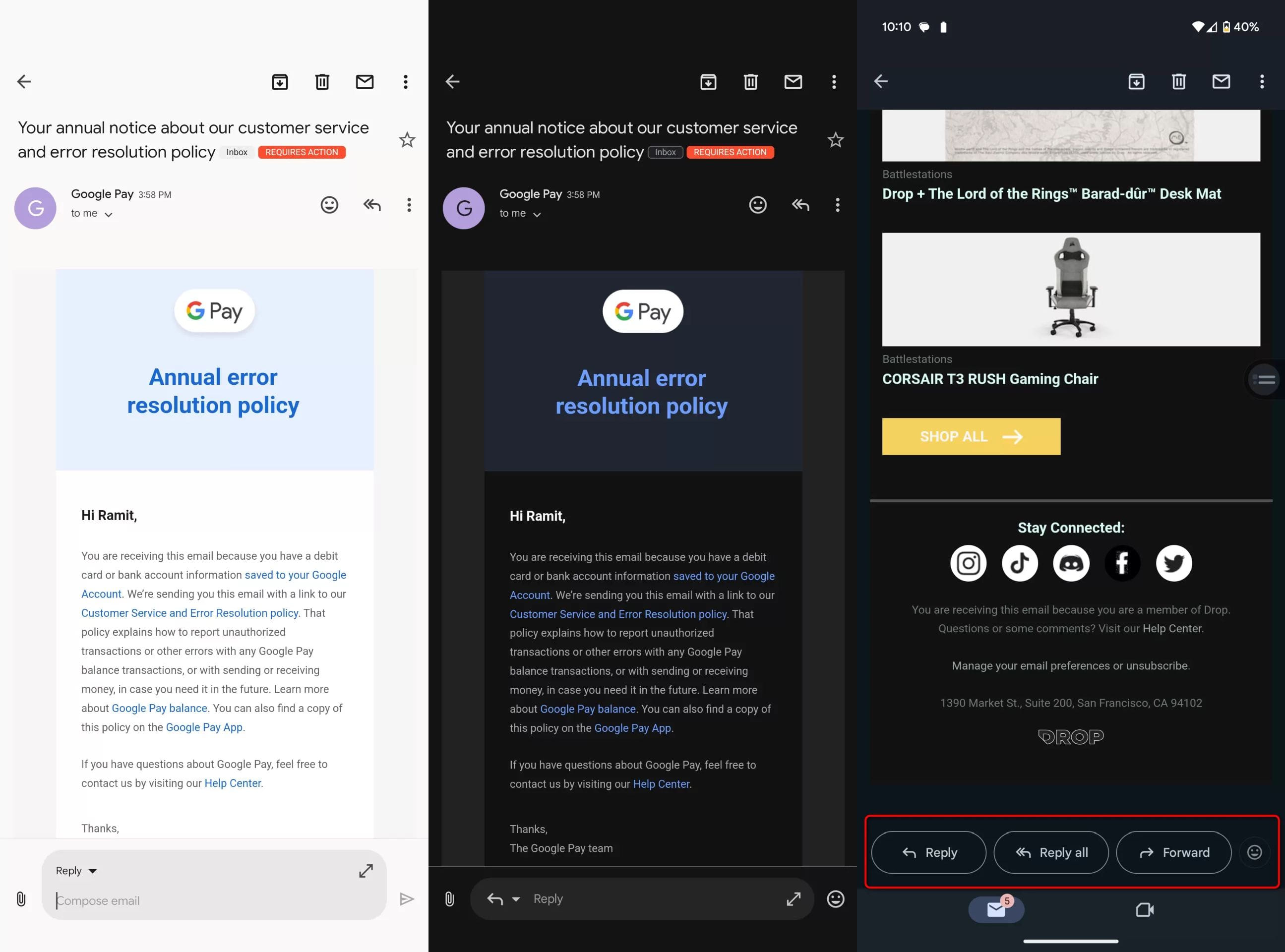 Amint azt az Android Police észrevette, a Gmail Androidhoz egy új üzenetmezőt tesztel, amely az e-mail szál alján jelenik meg. Ez az üzenetmező helyettesíti a Válasz, Válasz mindenkinek és Továbbítás gombokat az alkalmazás régebbi felhasználói felületén.
