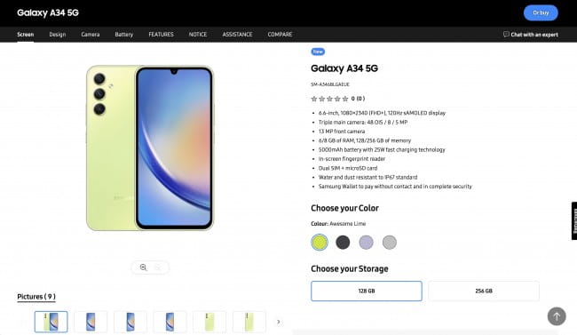 A Samsung svájci oldala eközben elhamarkodottan listázta a Galaxy A34-et a hivatalos weboldalán. Ez megerősíti a telefon specifikációit, dizájnját és minden fontos jellemzőjét, kivéve az árat.