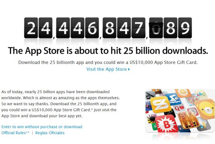 Az Apple ismét közel van egy mérföldkő eléréséhez, ezúttal a 25 milliárdodik letöltést várják és ezúttal is sorsolnak ki nyereményt.