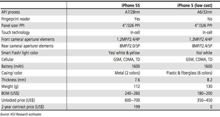 Ami az olcsó iPhone 5C-t illeti, a burkolat a Samsungnál sokat szidott, fényes polikarbonátból készül, az A6 chipset marad, valamint nem lesz ujjlenyomat-olvasó. Az iPhone 5S 200 dolláros ártól lesz megvásárolható debütálás után két év hűségszerződéssel az Egyesült Államokban, míg az olcsó iPhone 5C hasonló feltételekkel ingyen is hazavihető.