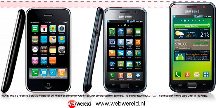 Az Apple úgy döntött, további képeket vet be a bíróságon, hogy bizonyítsa, a Samsung Galaxy családja bizony abszolút tőlük lopta a dizájnt. Az iPad vs Galaxy Tab 10.1 vita után az iPhone és a Galaxy S modelleket vette a cég górcső alá és a holland bíróságon beadta új keresetét, azonban itt is módosították a dél-koreai gyártó termékét, legalábbis a méreteket, mert ezúttal a gyártói logót meghagyták. Ahogy a lenti fotón is látható, az Apple úgy állítja be mintha a két telefon egy méretet képviselne, holott ez egyáltalán nincs így, valamint a kezelőfelülettel is játszanak. A méretbeli különbség a kevésbé szakértők számára is egyértelmű, hiszen míg az Apple iPhone 4 3.5 colos érintőkijelzővel rendelkezik, addig a Samsung i9000 Galaxy S-ben egy 4 colos változat teljesít szolgálatot, tehát a fizikai méretek sehogy sem stimmelhetnek.