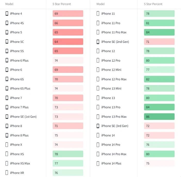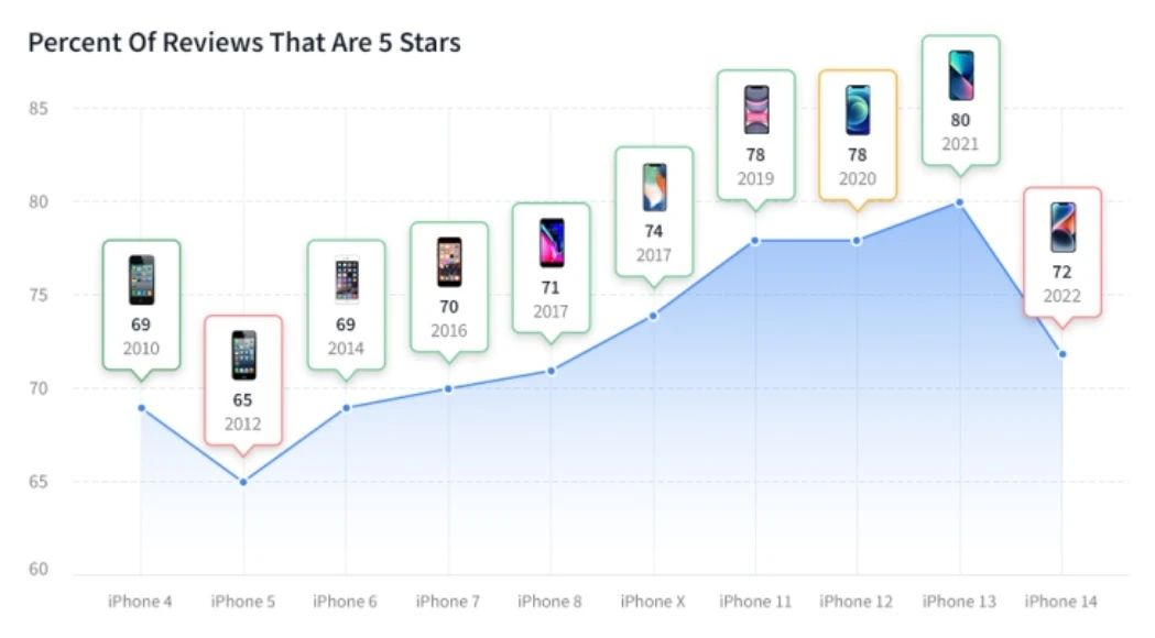 Az oldal megnézte, hogy az egyes években az alapmodell iPhone-okra vonatkozó értékelések hány százaléka adta a legmagasabb, ötcsillagos minősítést az egyes készülékekre. A 2010-ben az iPhone 4 készülékre érkezett értékelések 69%-a 5 csillagos értékelést adott a készüléknek. Ez az arány az iPhone 5 esetében 65%-ra esett vissza, bár 2014-ben jelentős fellendülés kezdődött, amikor az iPhone 6 értékeléseinek 69%-a 5 csillagos értékelést kapott.
