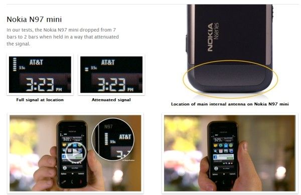 A múlt hét pénteki sajtótájékoztatón a nevén nevezett mobilok és gyártói kikérték maguknak az összehasonlítgatást, az Apple-nek azonban ez nem volt elég, õk mutatják be, hogy lássák az emberek, a Nokia N97 Mini mobil is ugyanúgy elveszti a térerõ egy részét, ha "rossz" helyen fogjuk meg (érdemes megnézni, hogy a lefogáskor is még 2 pálcika marad, tehát nem dobja el a telefon a hívásokat véletlenül sem, mint ahogy az iPhone 4 teszi).