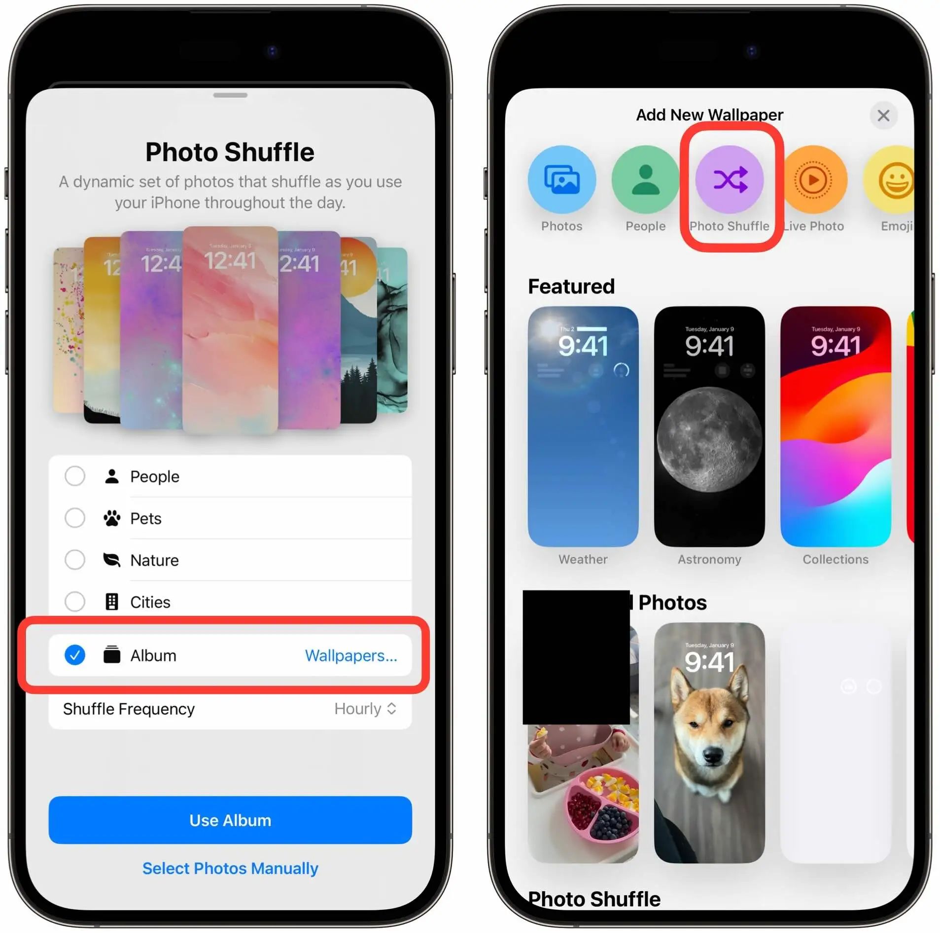 Az iOS 17 végre lehetővé teszi, hogy kiválaszthassa saját albumát a véletlenszerű lejátszáshoz. Korábban nem lehetett eldönteni, hogy mely fényképeket keverje össze. Most létrehozhat egy háttérkép mappát a fotókönyvtárában, és kiválaszthatja a Lezárási képernyő testreszabásakor.