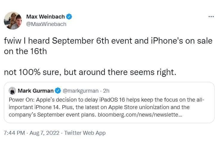 A legenda szerint az Apple nem szereti, ha egy háromnapos hétvége előzi meg az év egyik legfontosabb bejelentését és idén szeptember 5-én van a Labor Day az Egyesült Államokban. Ez a felvetés idén tévesnek bizonyulhat, mivel a hírhozó Max Weinbach azt hallotta forrásaitól, hogy az iPhone 14 szeptember 6-án kerül bemutatásra, a modellek pedig szeptember 16-án kerülnek forgalomba.