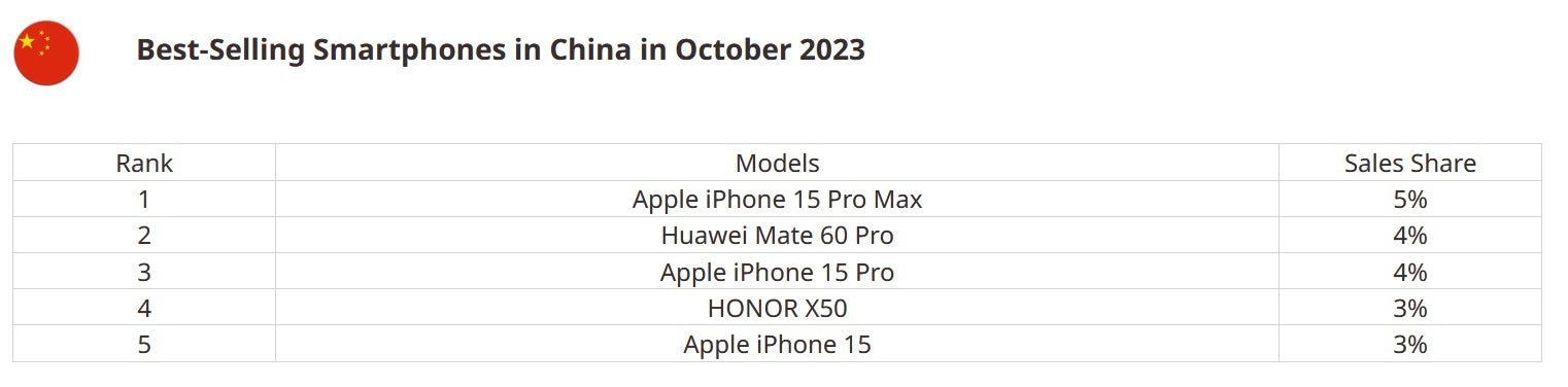 Októberre vonatkozóan, a legutóbbi hónapban, amikor a Counterpoint Research közzétette ezeket az adatokat, Kínában a legtöbbet eladott telefon a Huawei Mate 60 sorozat egyik modellje lehetett, igaz? Valójában a kínai okostelefon-piac vezető 5%-kal az iPhone 15 Pro Max volt a legtöbbet eladott okostelefon abban a hónapban. Rendben, akkor a hónap első öt helyezettje között a fennmaradó négy telefonban három vagy négy Mate 60-as sorozat (Mate 60, Mate 60 Pro, Mate 60 Pro+, Mate 60RS) kellett, igaz?