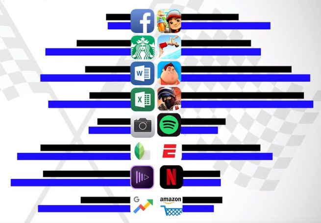 A fenti képen látható, melyik telefonnak meddig tartott a háttérbe tett alkalmazást előhívni, az iPhone XS Max feketével, a Note 9 kékkel jelölt. A gyorsaság az iOS 12-nek és az új, A12 chipsetnek köszönhető. Bár az app indító „csata” sem teljesen fedi a napi használatot, jóval közelebb áll ahhoz, mint a már említett, szintetikus tesztek.