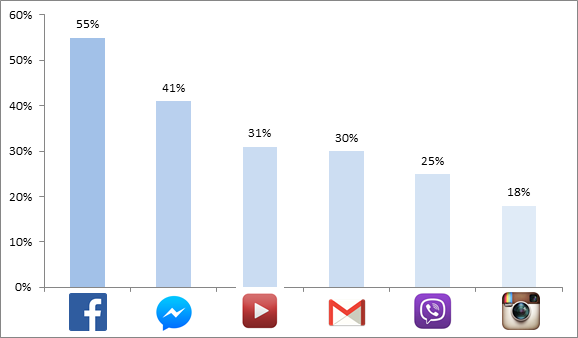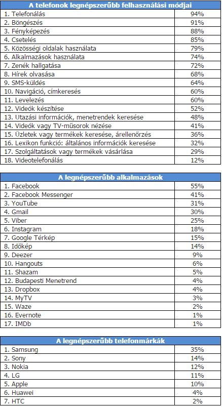 A megkérdezettek 97%-a telepített már legalább egy alkalmazást telefonjára, harmaduk (34%) pedig 20-nál is többet. Az alkalmazások népszerűségi rangsorát a Facebook vezeti 55%-kal, amit csak saját csevegő programja, a Facebook Messenger tudott megközelíteni 41%-os eredménnyel. A dobogó harmadik fokára a YouTube (31%) került, a pontszerző helyeket pedig a Gmail (30%), a Viber (25%) és az Instagram (18%) foglalták el.