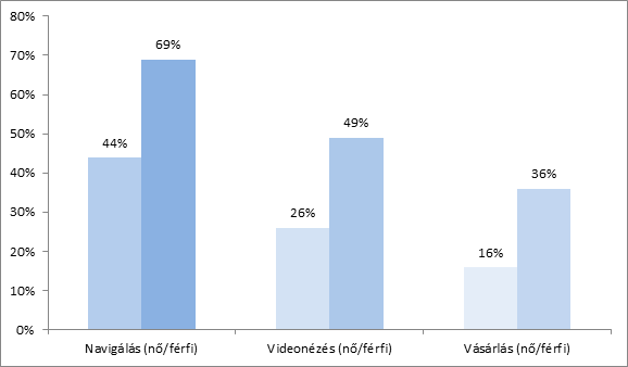 Úgy tűnik, a férfiak alaposabban kiaknázzák a telefonjukban rejlő képességeket, hiszen 81%-uk használ alkalmazásokat a telefonján, szemben a nők 61%-ával. A férfiak közel felének (44%) 20-nál is több alkalmazása van, a nők közül csak minden ötödik tölt le ennyi appot (19%). A mobilos videó- vagy tévénézés, a navigáció vagy címkeresés és a mobilvásárlás is erőteljesen férfias tevékenységnek számít. A nők 44%-ával szemben a férfiak 69%-a használja navigálásra telefonját. A videók esetében 26% és 49%, míg a vásárlásnál 16% és 36% a két érték.