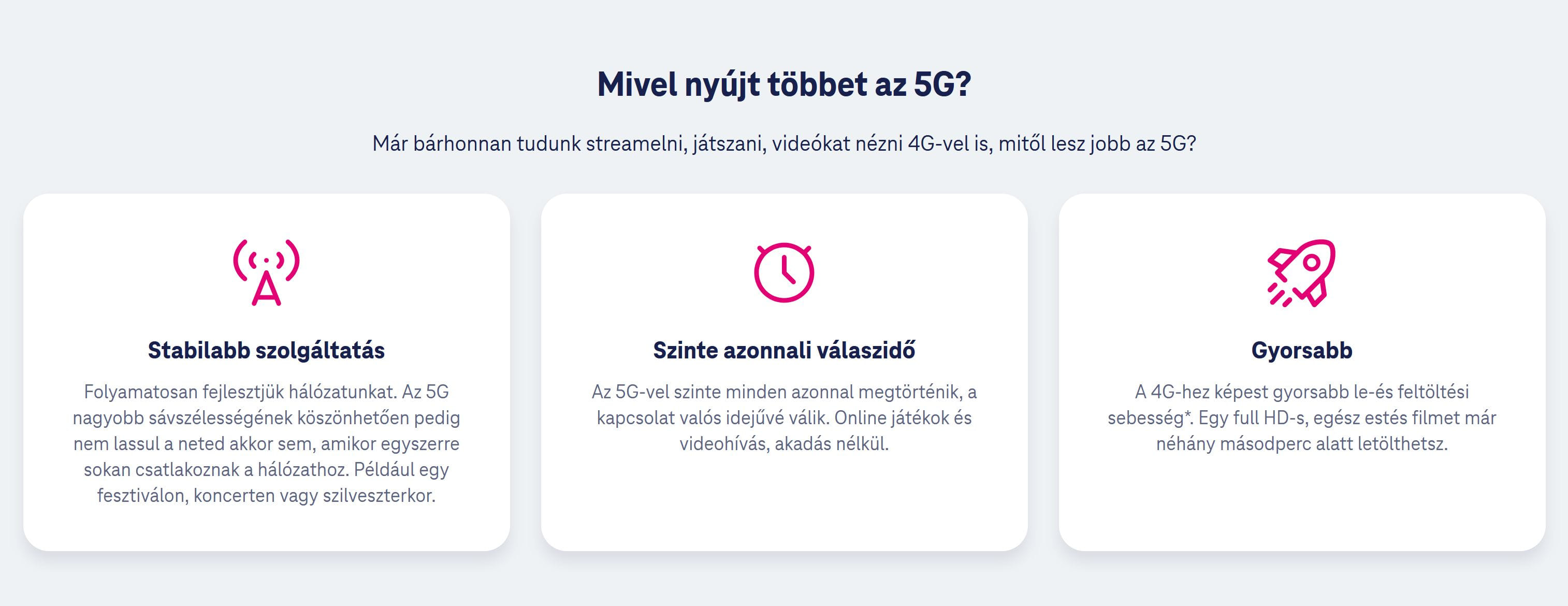 Az 5G hálózat igénybevételéhez az 5G lefedettségen túl megfelelő díjcsomag (idén nyáron június 1. és augusztus 31. között a kampány keretében csak mobilinternet-szolgáltatás szükséges), 5G képes készülék, és legalább 4G képes fizikai SIM vagy eSIM is szükséges, amelyről a vállalat weboldalán található bővebb információ: 5G hálózat - Magyar Telekom csoport