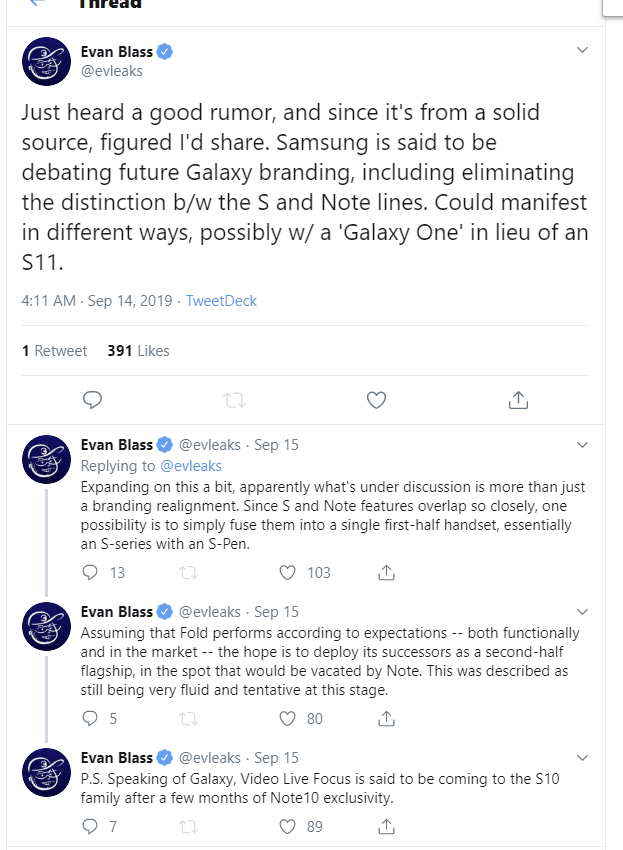 A hírről a megbízhatóságáról ismert Evan Blass ingformált Twitteren. Az új, összevont modellek Galaxy One néven kerülhetnének piacra, akár már a Galaxy S11 is, egyben ez lehetne az első „Galaxy S” S Pennel. Blas szerint ha a Galaxy Fold annyira bejön a Samsungnak, ahogy reméli, úgy a Note családot a Fold válthatja fel.