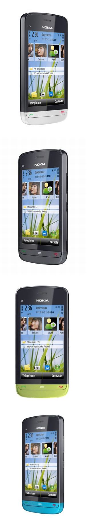 A finn gyártó ma hivatalosan is lerántotta a leplet a Nokia C5-03 készülékrõl. Az olcsó érintõképernyõs okostelefonon Symbian S60 5th Edition, tehát Symbian Touch rendszer fut. A 3.2 colos, 640×360 képpont felbontású, rezisztív érintõkijelzõ mellett elérhetõ Wi-Fi és HSPA, Bluetooth 2.0, microUSB port, 3.5 mm-es jack dugó, valamint öt megapixeles kamera, 640×352de vaku nincs hozzá. A 93 gramm tömegû, 13.8 mm vékony készülék méretét tekintve nagyon hasonlít a Nokia C6-01 mobilra.
