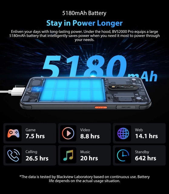 Ha már az energiáról beszélünk, a BV5200 Pro nagy, 5180mAh-s akkumulátorral felszerelve 7,5 órányi játékidőt, 14,1 órányi webböngészést és 20 órányi zenehallgatást tesz lehetővé.