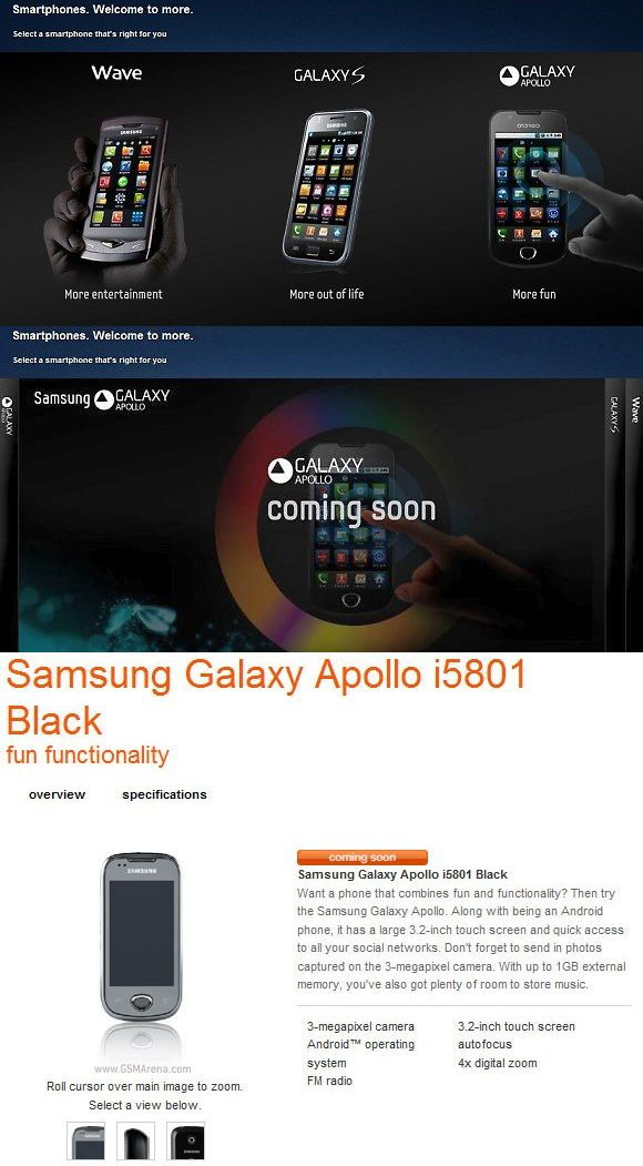 A nagyobbik dél-koreai gyártó Galaxy nevû szériája újabb tagot kap hamarosan, ezúttal Apollo néven. Minden elõzetes bejelentés nélkül került fel a Samsung brit honlapjára a Samsung Galaxy Apollo mobil, ezzel egyidõben a helyi Orange szolgáltatónál „Hamarosan” felirattal is listára került. A hivatalos nevén Samsung i5801 a Wave és a Galaxy S mellett az egyik legjobban promotált készülék, egészen pontosan rengeteg pletyka került ki róla.