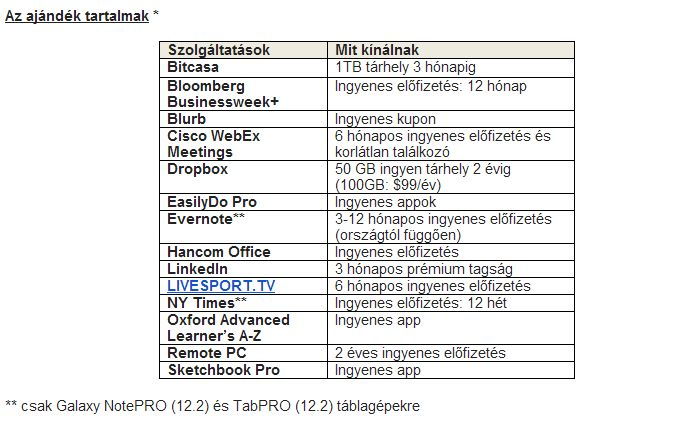 - Bitcasa: A Bitcasa lehetővé teszi a felhasználók számára, hogy digitális tartalmaikat saját, biztonságos „felhőjükben” tárolják, osszák meg, másolják, és streameljék. A Samsung Galaxy NotePRO és TabPRO tálagépek felhasználói világszerte ingyen meghosszabbíthatják három hónappal a Bitcasa prémium előfizetésüket (egy terabájtnyi tárterület) aktiváláskor.