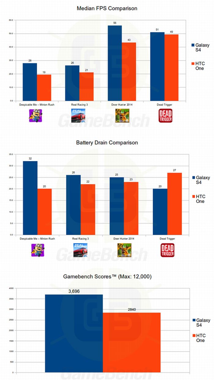 A Samsung Galaxy S4 megjelenése után nem sokkal derült ki, hogy a gyártó csalt a benchmark programok teljesítmény-mérésénél egy algoritmus segítségével. Most elkészült a trükk teszt is. A teszt alkalmazásoknál való optimalizáció nem újkeletű, nemcsak a Samsung, de más gyártók is élnek ezzel a lehetőséggel, a PC-k esetében is. A trükk annyi, hogy benchmark program indításakor a rendszer automatikusan maximumon pörgeti a processzorokat, hogy a maximum teljesítményt nyújtsák, ez azonban nem feltétlenül fedi a készülékek napi szintű teljesítményét általános felhasználás esetén. A GameBench nevű alkalmazás állítólag képes ezeket a trükköket kiküszöbölni és a valós értékeket mérni. A két nagyágyút, a Samsung i9505 Galaxy S4-et és a HTC One-t állították szembe, hogy kiderüljön az igazság. A GameBench indítás után a háttérben fut és több, megadott játékkal kell játszani a telefonon, így nem a benchmarkot veszi figyelembe a processzor. Annak ellenére, hogy a Samsung bukott le a csaláson, egyértelműen jobban teljesít a GameBench számait tekintve.