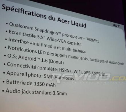 Az Acer Liquid A1 specifikációja hasonló, mint a többi felsõkategóriás mobilé, így adott a 3.5 colos, 800×480 pixeles, kapacitív érintõkijelzõ, valamint egy egyedi, egyujjas használatra kihegyezett, az Acer által kifejlesztett kezelõfelület. A tudáslistában HSDPA, GPS, Wi-Fi, Bluetooth, 3.5 mm-es jack csatlakozó, Facebook/Flick/Twitter kliens és 5 megapixeles kamera szerepel.