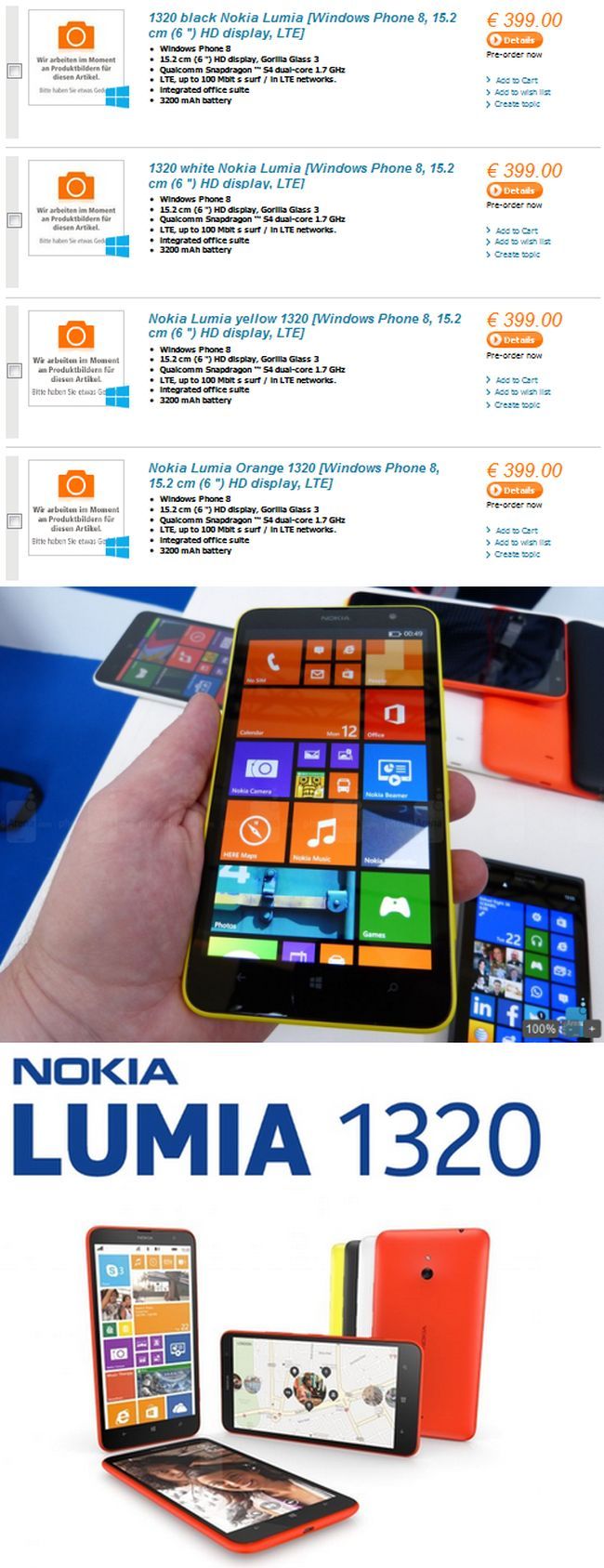 A finn gyártó Nokia Lumia 1320 óriásmobilja beárazásra került, 400 euróért lehet hozzájutni a megjelenéskor. A fejlesztési kódnevén Batmanként is emlegetett Windows Phone 8-as okostelefon 399 eurós áron rendelhető elő Németországban a notebooksbillinger.de oldalon. A Lumia 1320 hat colos, 720p felbontású IPS LCD kijelzővel felszerelt, a burkolat alatt kétmagos, 1.7 gigahertzes Snapdragon 400 processzor dolgozik Adreno 305 grafikus gyorsító és 1 gigabájt RAM társaságában. A beépített tárhely 8 gigabájt, ez akár 64 gigabájtos microSD kártyával is bővíthető a felhasználó igényei szerint. A hátlapi kamera 5 megapixeles és f/2.4 rekeszt kapott, az előlapi VGA felbontású. A készülék 3200 mAh-s akkumulátora gondoskodik a megfelelő üzemidőről akár LTE hálózatokon is. A modell fekete, fehér, sárga és narancs színekben rendelhető elő.