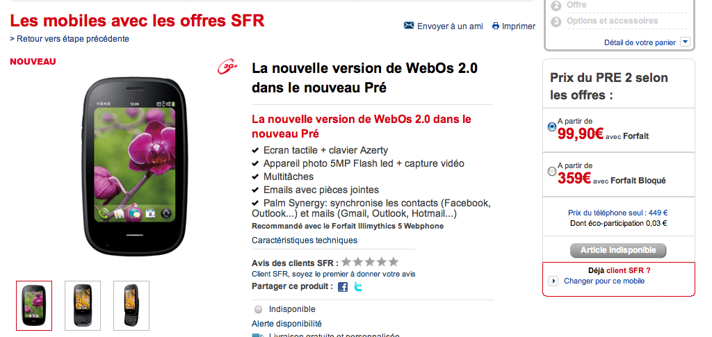 Tegnap jelentették be a Palm Pre 2 mobilt a webOS 2.0 rendszerrel együtt, ám alig két nap múlva máris megvásárolható lesz a francia SFR szolgáltatónál. Számunkra az egyik kardinális kérdés az ár, ez pedig egyáltalán nem rossz. Elõfizetéssel 99 eurót, kártyásan pedig 449 eurót kell érte kicsengetni. A weboldalról az is kiderül, hogy tényleg 1 gigahertzes processzor került a Pre 2-be, amelyet 512 megabájt RAM egészít ki, de megtalálható lesz az öt megapixeles kamera, a beépített 16 gigabájtos háttértár is a tudáslistában.