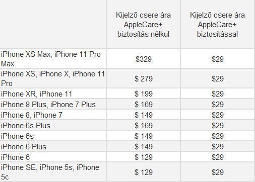 Nem kerül többe a csere mint a korábbi modelleknél, legalábbis ami a már új, gyönyörű, élénk színeket és magasabb kontrasztot biztosító Samsung AMOLED panellel rendelkező iPhone-okat illeti, ilyen az iPhone XS, az iPhone XS Max például. AppleCare+ biztosítással a tengerentúlon a kijelző cseréért 29 dollárt kell fizetni, aki ilyen védelemmel nem rendelkezik, annak 329 dollárba kerül a művelet az iPhone 11 Pro Max esetében. Szintén 29 dollár a biztosított ár, ám a teljes összeg 279 dollár az iPhone 11 Pronál, míg az iPhone 11 LCD cseréje a legolcsóbb, 199 dollárt kér az Apple egy AppleCare+ nélküli cseréért.