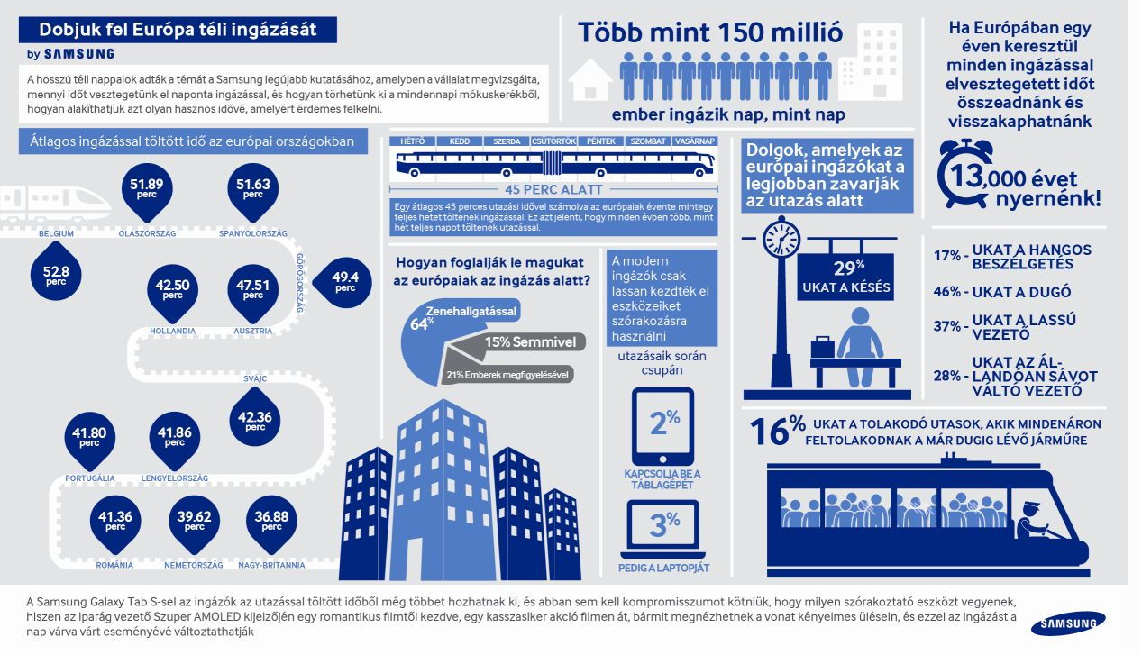 A Samsung megbízásából készült reprezentatív felmérés szerint az európaiak átlagosan 45 percet töltenek naponta munkába járással, ami évente 180 órát jelent, vagyis egy teljes hetet vesztegetnek el a lakóhelyük és a munkahelyük közötti ingázással. Holott a tömegközlekedés monotonitásából adódóan és a modern technológiai eszközöknek köszönhetően az utazásra fordított időt könnyedén hasznos időtöltéssé változtathatják. Európában nap mint nap emberek milliói indulnak el reggelente munkába, ám a hideg, téli hónapok és a lehangoló időjárás beköszöntével az ingázás sokak számára kellemetlen élménnyé, unalmas időtöltéssé válik.