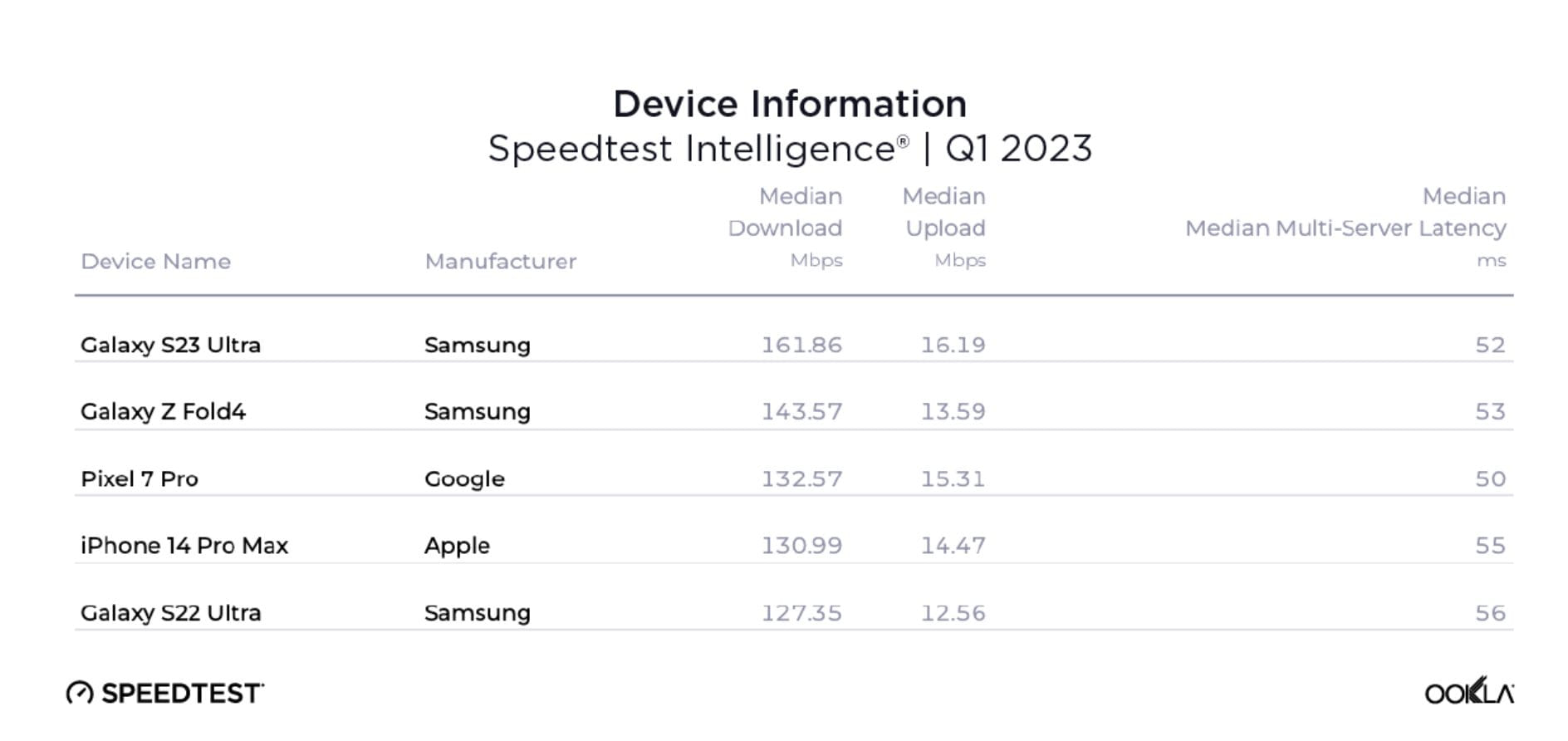 Az új Samsung Galaxy S23 Ultra 161,86 Mbps medián letöltési sebességgel érdemelte ki a csúcsot, a második helyen a Galaxy Z Fold4 végzett 143,56-tal, a Google Pixel 7 Pro pedig 132,57 Mbps sebességgel a harmadik helyen landolt.