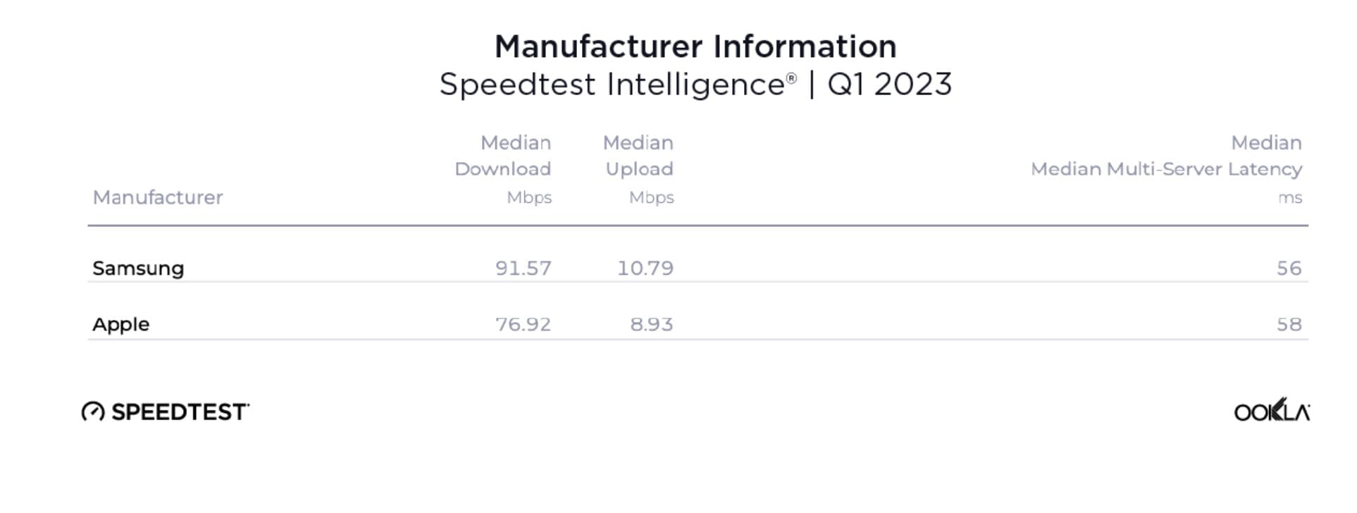 Az összképet figyelembe véve az összes iPhone és Samsung készülék letöltési sebességének mediánját tekintve az utóbbi került előnybe 91,57 Mbps mediánsebességgel, szemben az Apple 76,92 Mbps-ával.
